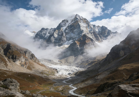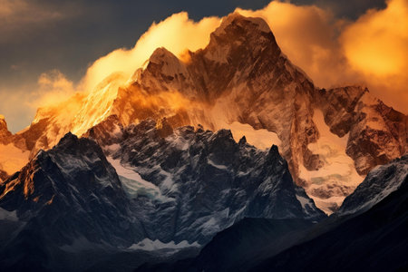 the photo captures a stunning mountain landscape with clouds and snow, reminiscent of himalayan art. the backlit photography creates a mysterious backdrop, highlighting the photo-realistic details of the scene. shot with a canon eos 5d mark iv, the image showcases a mix of dark, white, and amber tones, evoking a sense of mysticism and enchantment. ai generated