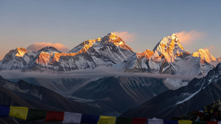 Nepal Himalaya mountain range at sunset with prayer flags.