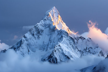 A breathtaking view of a snow-covered mountain peak bathed in the warm light of sunrise, with clouds partially obscuring the lower slopes. perfect for nature-themed designs, wall art, or desktop backgrounds, showcasing the serene beauty of mountainous landscapes. Generative AI