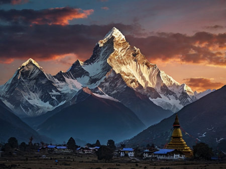 A stunning view of a snow-capped mountain peak illuminated by the golden light of the setting sun in the Himalayas.