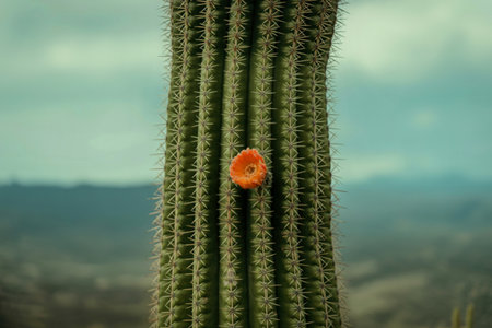 A close-up view of a tall saguaro cactus trunk featuring a vibrant orange flower, with a blurred desert landscape in the background.