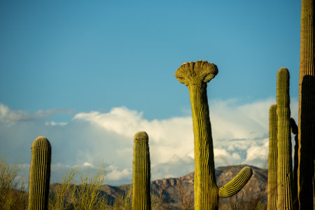 Various huge green saguaro cacti in Sonora desert near Tucson , Arizona. Sunny day, no people in Saguaro National Park. Copyspace.