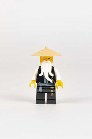 Yekaterinburg. Russia. 04.08.2021. Toy hero Master Wu in a black kimono and a straw hat from a set of Lego ninjago on a white background. close-up. selective focus