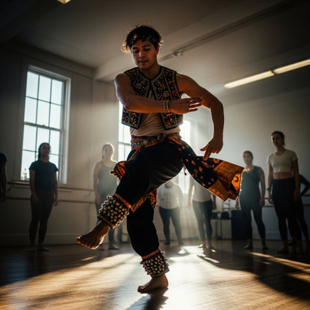 Low angle, cinematic editorial photograph capturing an energetic dance instructor leading a class in