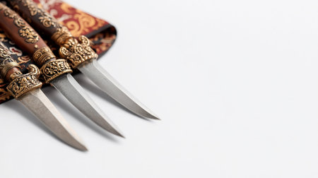 Three traditional Tibetan Phurba daggers with intricately decorated handles and sharp blades, resting on a white background with copy space.