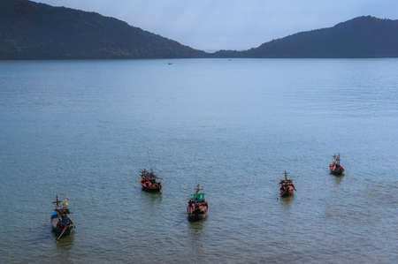 Birds eye view on sea bay with mountains and traditional Thai fishing boats in Kui Buri, Thailand