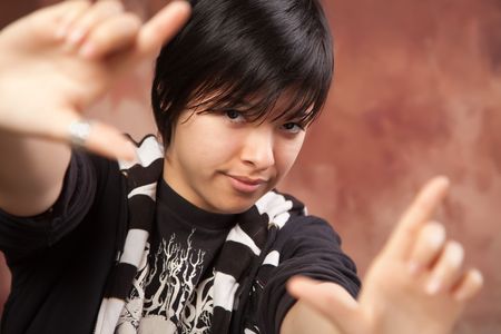 Attractive Ethic Girl Poses for Her Portrait Making a Frame with Hands.
