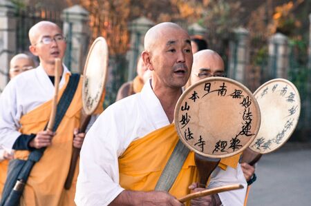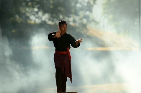Young Asian man in traditional clothes practicing qigong in the street.