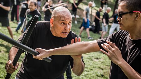 Large group of students practice filipino eskrima arnis stick fight techniques on kapap martial arts seminar