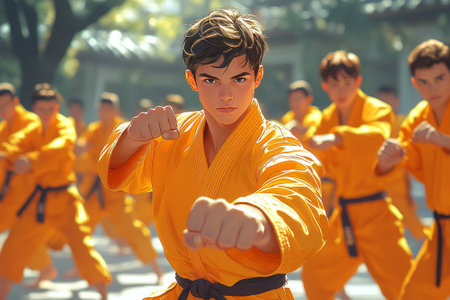 Young martial artist leads class outdoors