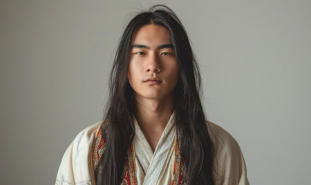 Portrait of young Asian man with dark long hair in traditional clothes looking at camera