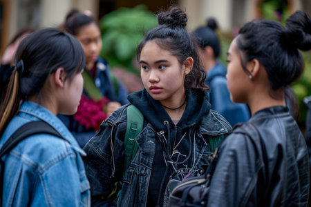 Unidentified female high school students in the street.