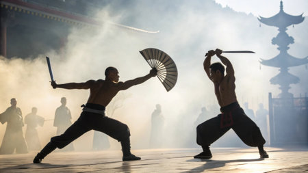 A pair of martial artists one with a broad fan the other with twin daggers engage in a dynamic routine surrounded by swirling fog. The soft lighting casts dramatic shadows on their.
