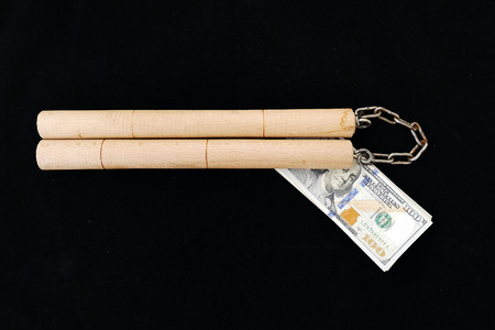 Samurai sword on a black wooden table close up