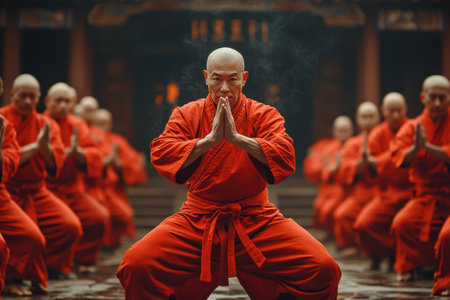 Under the soft glow of morning light, a group of martial artists dressed in vibrant red uniforms perform synchronized movements. The atmosphere is calm and focused, highlighting their dedication and discipline while practicing in a historic temple.