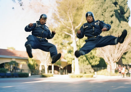 A group of individuals demonstrating karate moves with precision and skill on a sandy beach, Focus on the precision and skill required for a successful kick