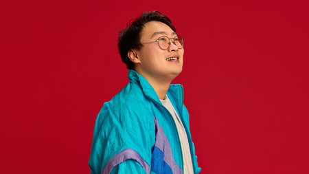 Side view close up portrait of young Asian man wearing glasses with light smile looking away against red background. Concept of human emotions, fashion and style, trendy, youth. Ad