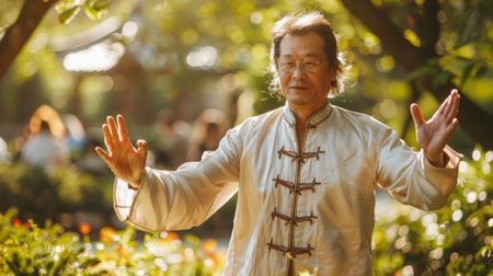 Elderly man in traditional attire practicing Qigong surrounded by lush greenery.