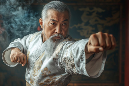 An experienced Fu master demonstrates his mastery with a powerful fist, dressed in elegant traditional clothing. The tranquil atmosphere enhances his focused expression, surrounded by swirling smoke.