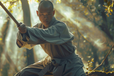 In a tranquil forest, a disciplined young martial artist focuses intently while wielding a staff, surrounded by soft rays of sunlight streaming through the trees, showcasing his dedication.