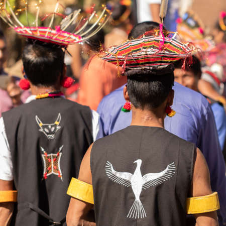 Abstract rear portrait of Naga men wearing traditional headgear made of straw
