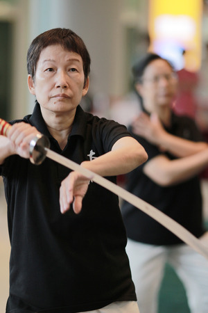CHENGDU, CHINA - JUNE 4, 2012: Unidentified people practicing tai chi on the street of Chengdu, China. In China, tai chi is categorized under the Wudang grouping of Chinese martial arts, applied with internal power.