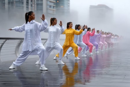 Multiple individuals dressed in colorful outfits perform tai chi movements on a foggy waterfront early in the day.