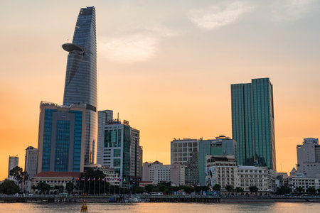 Ho Chi Minh City, Vietnam. May 19, 2019: Bitexco Financial Tower and Saigon business district seen from Saigon river. Urban development with modern architecture