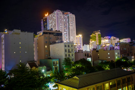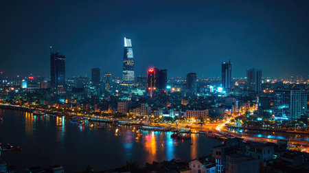 Iconic skyline of Ho Chi Minh City, Vietnam, at night with bright lights. No people, copy space.