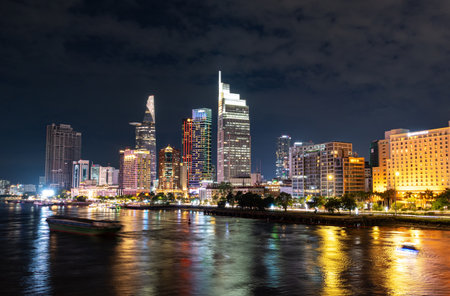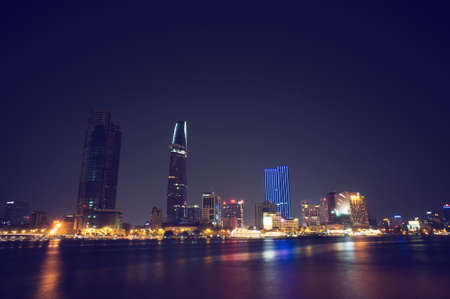 Cityscape of Ho Chi Minh at night with bright illumination of modern architecture, viewed over Saigon river in Southern Vietnam.