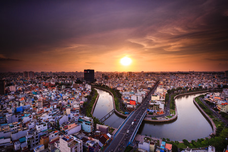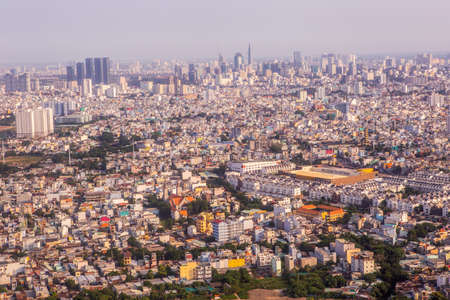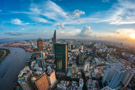 Ho Chi Minh city skyline aerial panoramic view at sunset. Ho Chi Minh is the largest city in Vietnam.