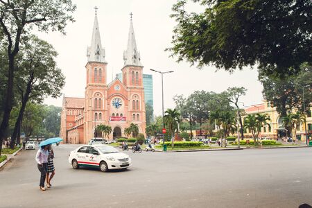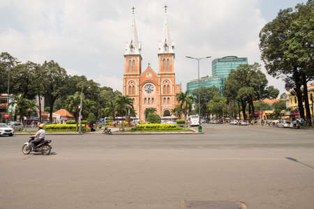 Ho Chi Minh city, Vietnam - February 15, 2017: Motorbike traffic on the road next to The Notre-Dame Cathedral Basilica of Saigon