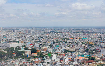 Ho Chi Minh City skyline aerial view with small colored residential houses and the river, medium class district of the capital of Vietnam