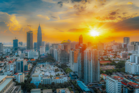 Amazing aerial view of Saigon cityscape under orange sunset sky