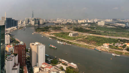 Ho Chi Minh City, Vietnam - March 12, 2019: Downtown. looking upstream of Song Sai Gon River in wider cityscape of skyscrapers, lower housing, river traffic and to be developed terrains.