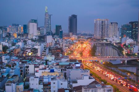 Apartment buildings, modern skyscrapers and broad avenue in Saigon, Vietnam (Ho Chi Minh City). Elevated view at twilight.