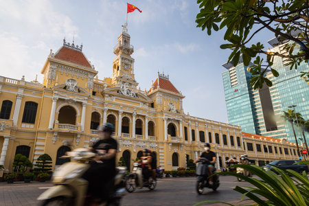 Ho Chi Minh City, Vietnam - November 07, 2022: Ho Chi Minh City hall. Scenic view of the Ho Chi Minh City Hall Vietnam. Saigon popular tourist destination of Asia. Traffic in front of the building