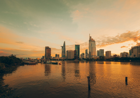 Panorama of Ho Chi Minh viewed over Saigon river. Breathtaking dramatic light of sunset is highlighted by lens flare effect created by vintage photo equipment.