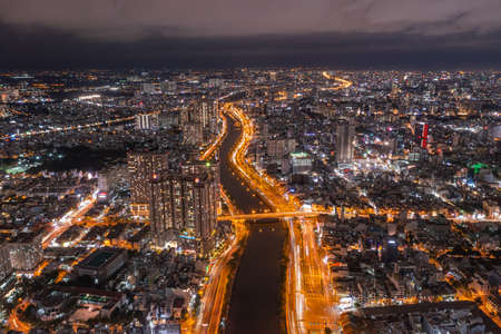 Saigon - May 17, 2021: Aerial photo of Ho Chi Minh city at night