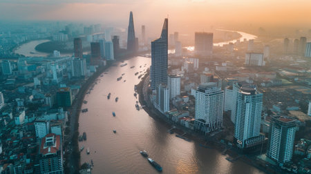 Stunning aerial view of Ho Chi Minh City showcasing iconic skyscrapers and a bustling river, wrapped in a hazy atmosphere, perfect for urban exploration and travel themes.