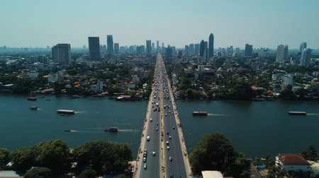 A stunning aerial view capturing the dynamic urban cityscape with a river flowing alongside. The image features busy traffic and modern architecture, showcasing a vibrant metropolis under clear skies.