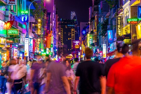 Ho Chi Minh City, Vietnam - April 26, 2018: lights of night Bui Vien Street with its numerous neon sign boards, headlights of motorcycles and a walking crowd. The famous nightlife area in Saigon.