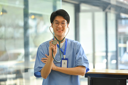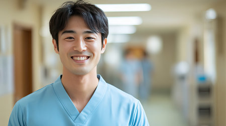 A young male nurse stands in the hospital corridor, demonstrating professionalism and compassion in healthcare.