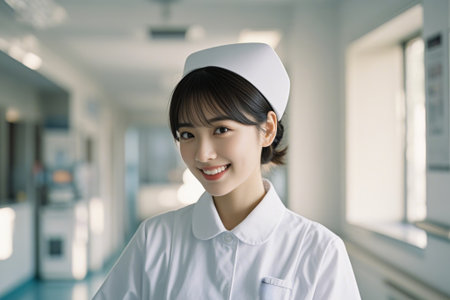 Portrait of a beautiful young asian nurse smiling in hospital corridor