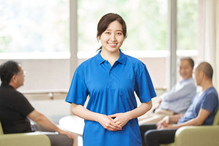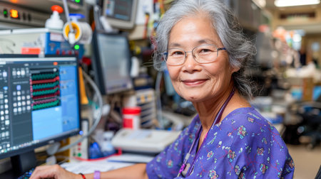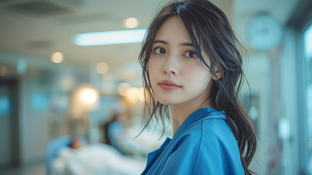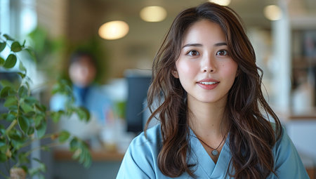 Portrait of a young Asian woman with long wavy hair, wearing a blue scrub, smiling in a bright office environment.