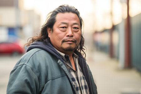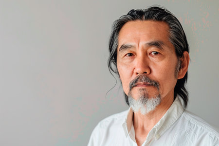 Portrait of mature Asian man in the city streets. Looking at camera.