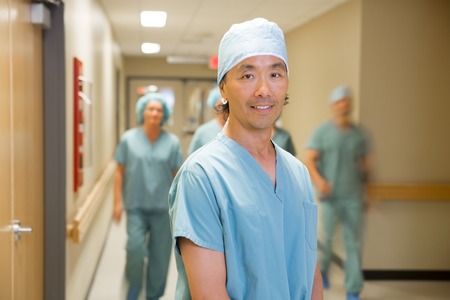 Portrait of male doctor with medical team walking in background at hospital corridor