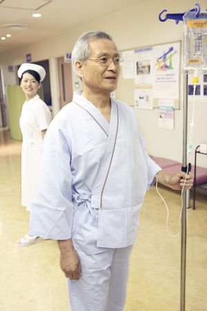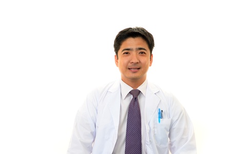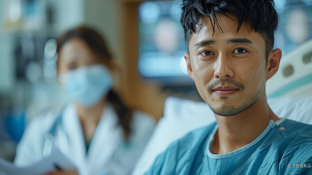 Portrait of Asian male doctor looking at camera while his female patient sitting in background