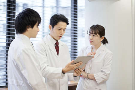 Nurse, tablet and healthcare of Japanese woman reading with planning, web document and medical checklist in hospital. Surgeon, nursing and online research for health, wellness and clinic care help