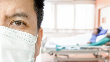 Closeup half face of a doctor wearing medical mask with blurred of patient on hospital bed background